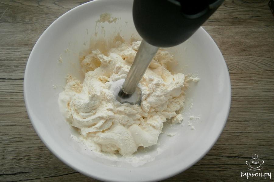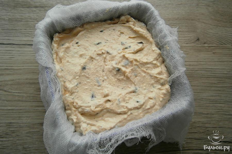 6. Массу хорошенько перемешать. Форму застелить куском влажной марли, которую нужно сложить вдвое, втрое, выложить в нее творожно-шоколадную смесь.