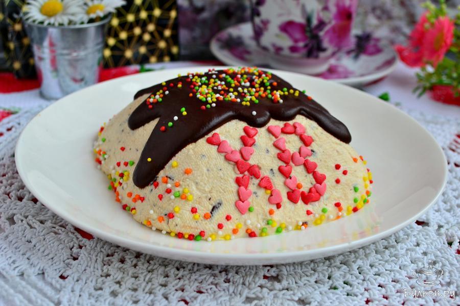 8. Далее, творожную пасху аккуратно освободить от марли, перевернув ее на тарелку. Оставшиеся 20 г черного шоколада поместить в горячее молоко, перемешивая, дать ему растопиться. Мешать нужно до получения однородной глазури. Покрыть глазурью пасху, украсить посыпкой. Приятного аппетита.