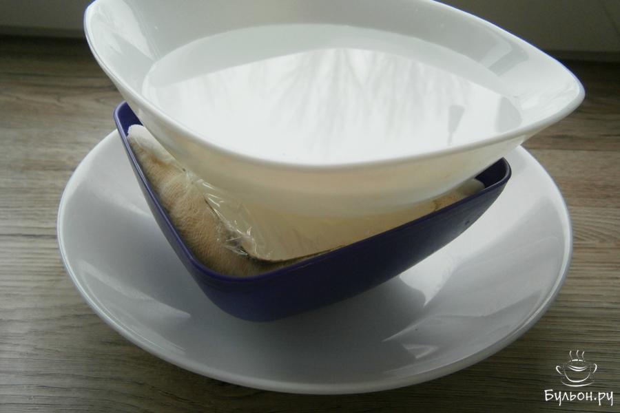 7. Концами марли прикрыть массу, сверху поместить любой гнет, у меня - миска с водой. Под саму форму поставить тарелку. Отправить эту конструкцию в холодильник часов на десять. Периодически выделившуюся сыворотку нужно с творога сливать.
