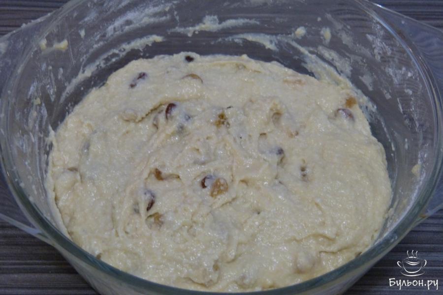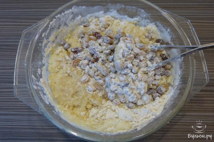 5. К творожной массе добавить муку с дрожжами и солью, теплое молоко, изюм (смешанный с 1 ложкой муки).