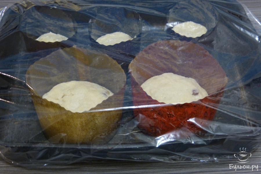 7. Формы для выпечки куличей смазать растительным маслом (дно и бока), выложить тесто на 1/3 формы, поставить на противень, закрыть пищевой пленкой и дать подняться. Так как тесто на куличи сдобное, расстаиваться оно будет 2.5-3 часа.
