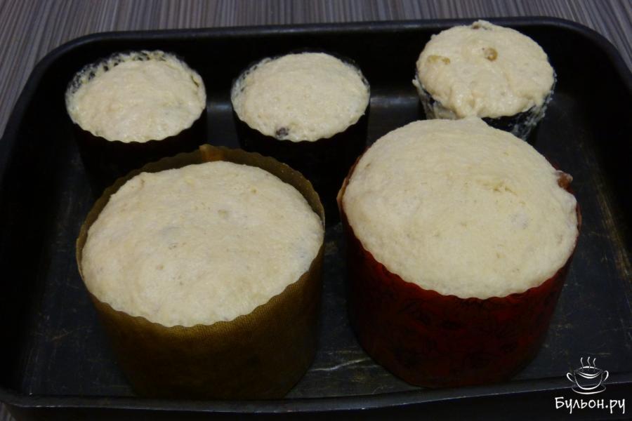 8. Как только тесто поднимется до края формы, разогреть духовку до 200 градусов. Очень аккуратно перенести куличи в духовку. Через 5-10 минут температуру убавить до 170 и продолжать выпекать около 30 минут. Чтобы куличи не опали, первые 15 минут выпекания духовку открывать нельзя.