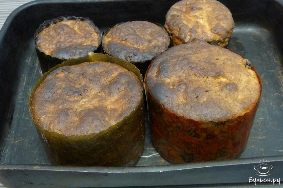 9. Проверить готовность деревянной шпажкой или зубочисткой, если сухая - значит готовы. Вынуть противень из духовки, оставить куличи в форме до остывания.