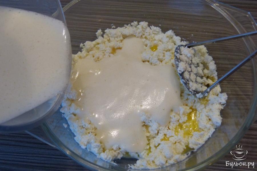 4. Отдельно в глубокой чаше растереть творог, добавить к нему растопленное и немного охлажденное сливочное масло, ванилин, взбитые яйца. Хорошо перемешать.