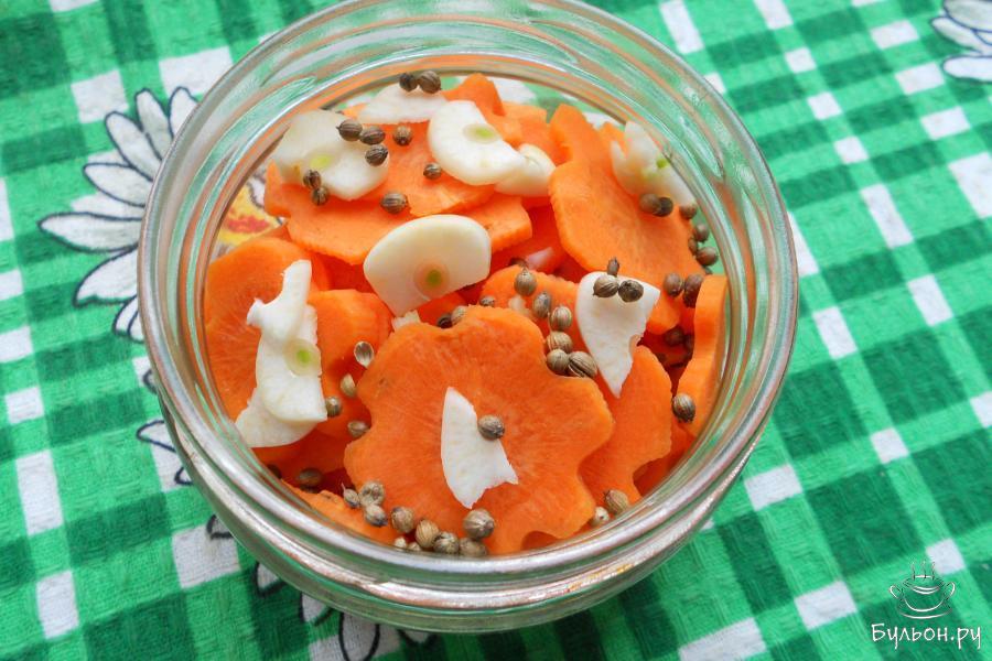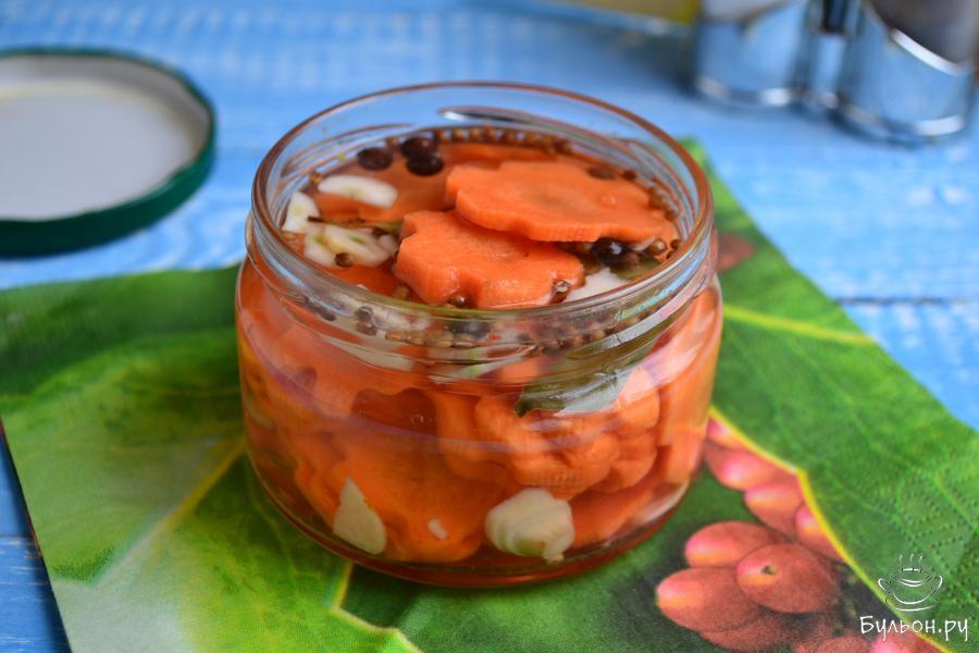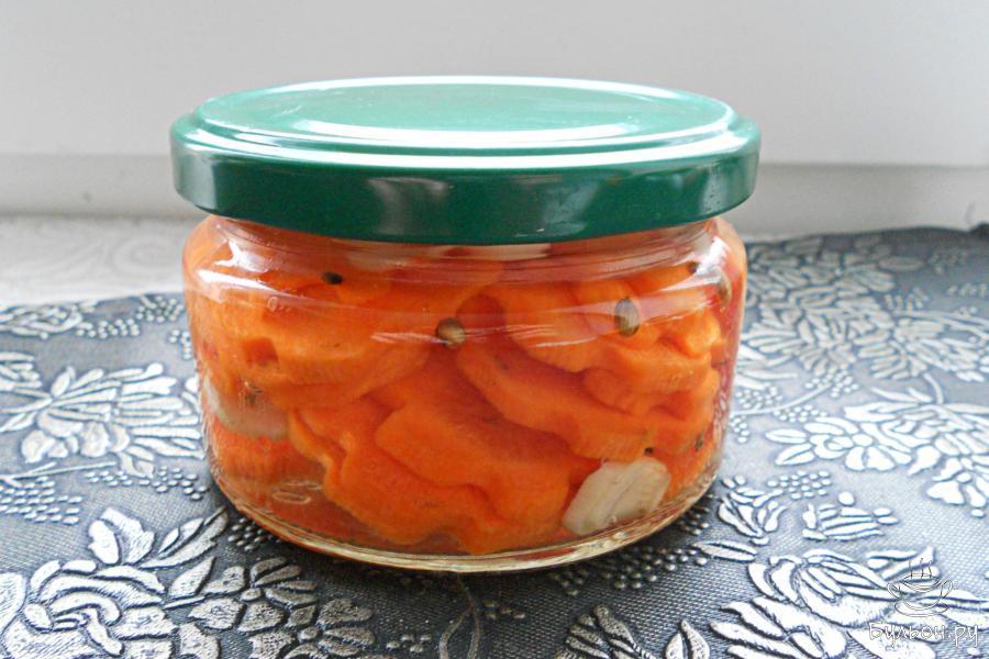 6. Баночку с морковью закрутить, оставить до полного остывания при комнатной температуре. Далее поместить баночку в холодильник. Через 6 часов морковь можно пробовать.