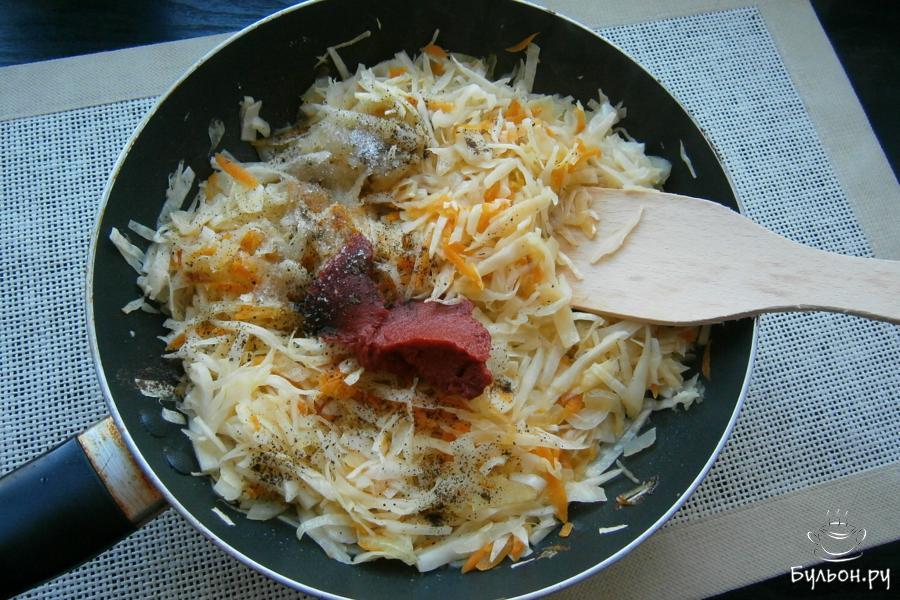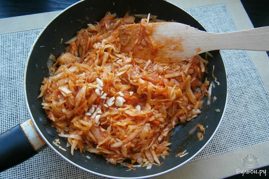 7. Всыпать также, паприку и влить горячую воду. Все перемешать, тушить капусту на слабом огне минут десять, перемешивая ее. В конце добавить мелко порезанный зубчик чеснока.