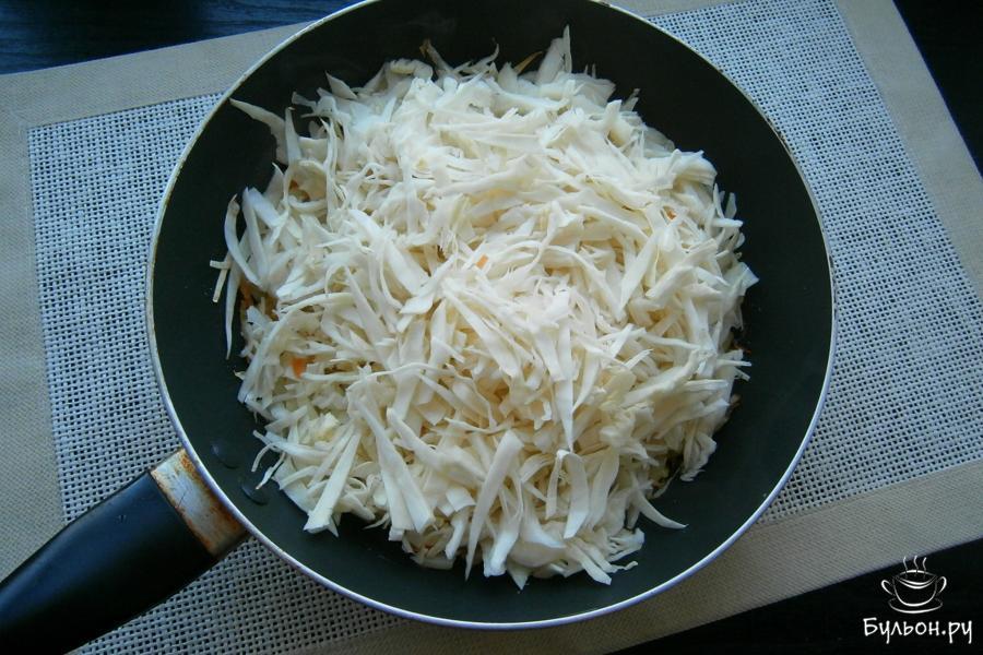 10. Каждую часть теста раскатать в лепешку, равную диаметру чаши мультиварки. Чашу чуть смазать маслом растительным, выложить на дно одну лепешку, на нее - часть капусты.