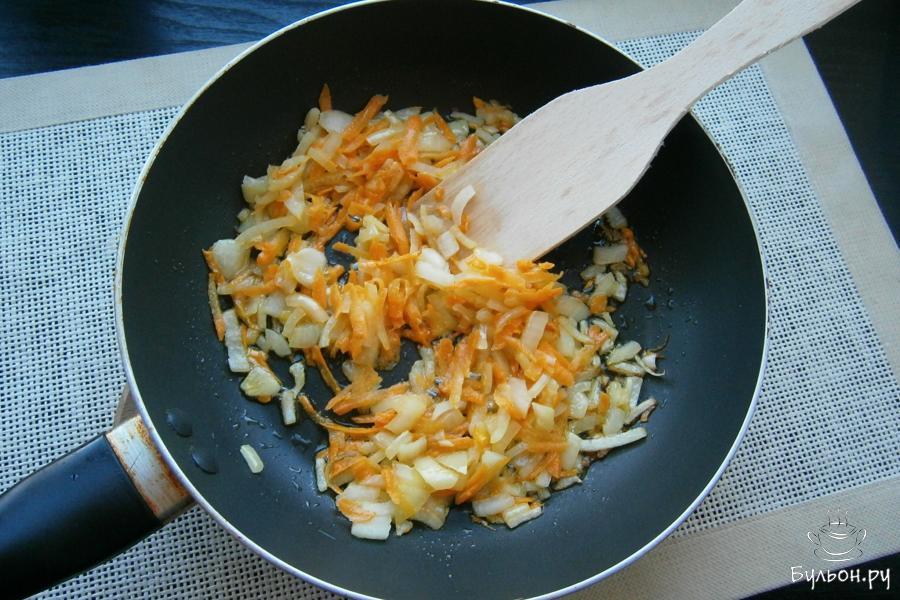 4. Порезать небольшими кусочками лук, морковку натереть, обжарить овощи до мягкости, добавив в сковороду 3 ст. ложки масла растительного.