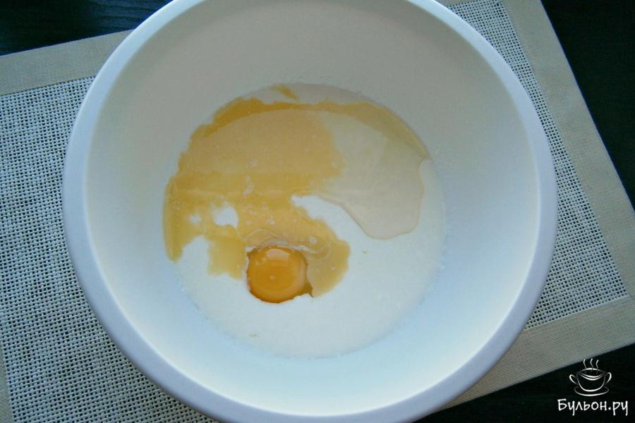 1. К кефиру комнатной температуры добавить растопленное и немного охлажденное сливочное масло, 2 ст. л. сахара, сырое яйцо, 1 ч. л. поваренной соли и 2 ст. л. масла растительного. Все тщательно размешать.