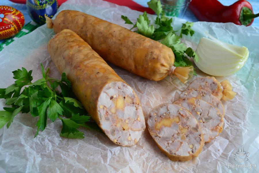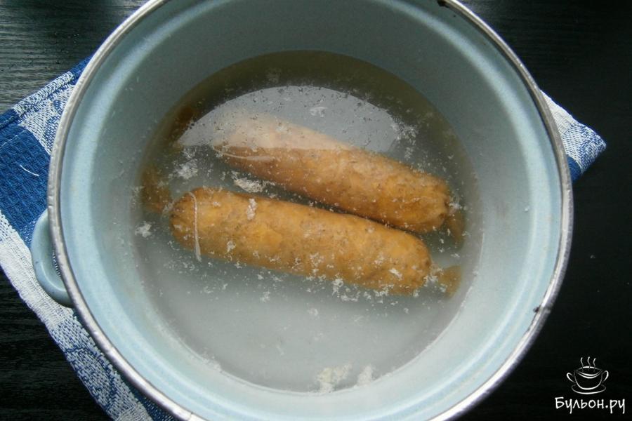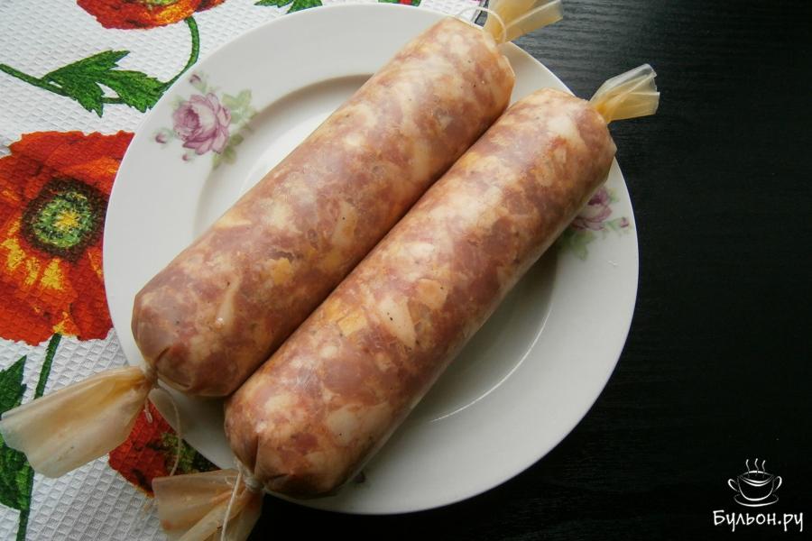 10. После приготовления, колбасу сразу же залить водой из-под крана минут на 15, после чего обсушить, дать остыть полностью и отправить в холодное место на несколько часов, лучше - на ночь.