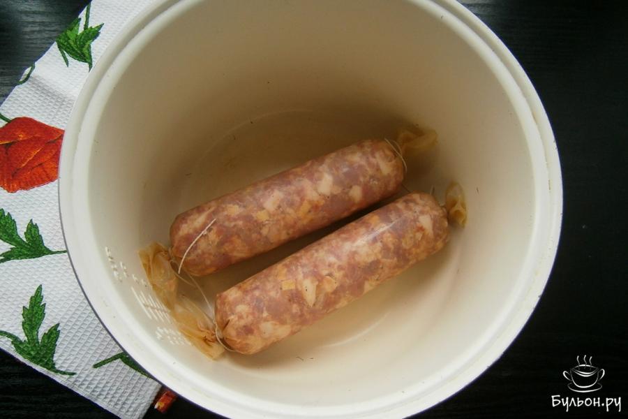 9. Я готовила колбаску в мультиварке. Разместить колбасу в чаше, влить воду холодную, чтобы она покрыла батоны. Выставить функцию "мультиповар", температура - 82-83 град., время - два часа.