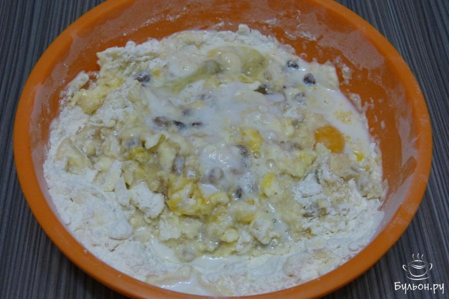 3. Затем добавить молоко, все перемешать до однородной консистенции. Тесто получится густое, как на оладьи.