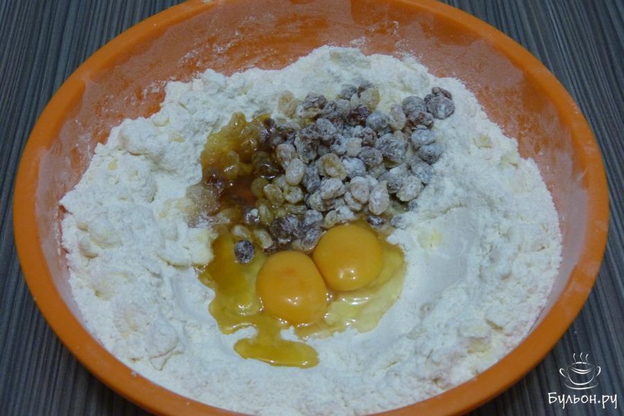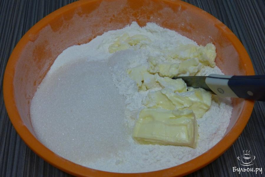 1. Муку просеять, добавить сахар, соль, размягченное и порубленное сливочное масло (20 грамм оставить для смазки формы), перемешать.