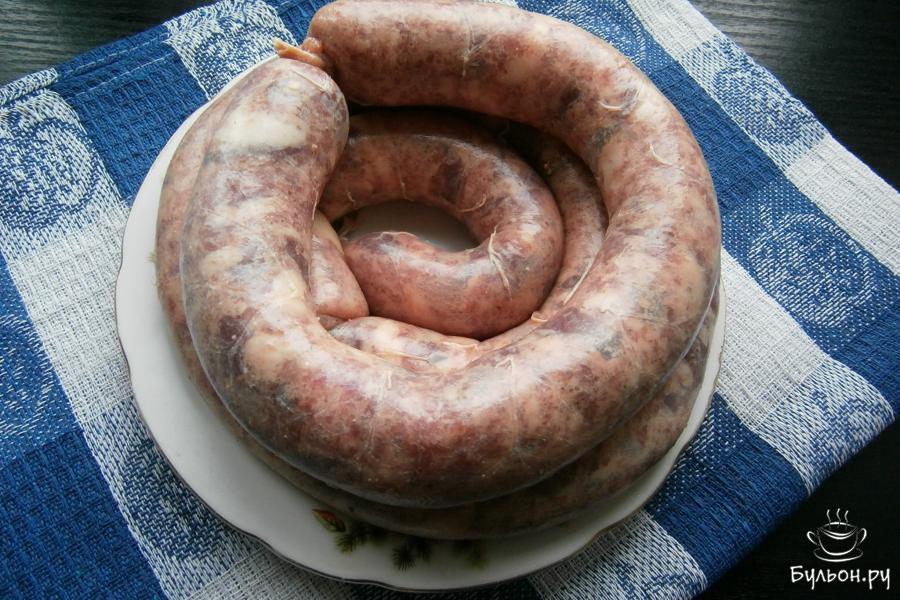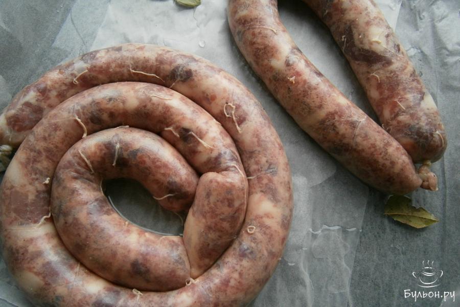 6. Наполнить промытые кишки приготовленным фаршем не плотно, используя специальную насадку или воронку, вырезанную из бутылки пластиковой. Концы кишок плотно перевязать.