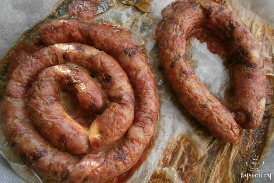 9. Запекать колбаску в духовке, выставив температуру 180 град., около одного часа. Готовую колбасу остудить, завернуть в пергамент и поместить для хранения в холодильник. Нарезать нужно охлажденную колбасу. Хранится такая колбаска может в холодном месте одну неделю. Приятного аппетита.