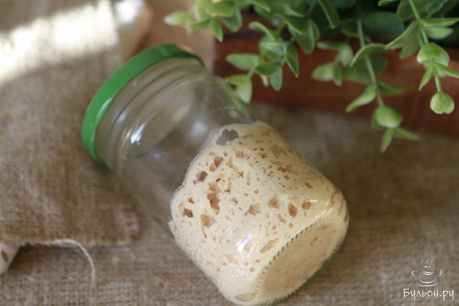 5. Третий день: закваска начинает потихоньку набирать всю свою мощь и силу. Наблюдается брожение в банке. Кормим ее по такой же схеме: 35 гр закваски плюс 35 гр ржаной муки плюс 35 мл воды.