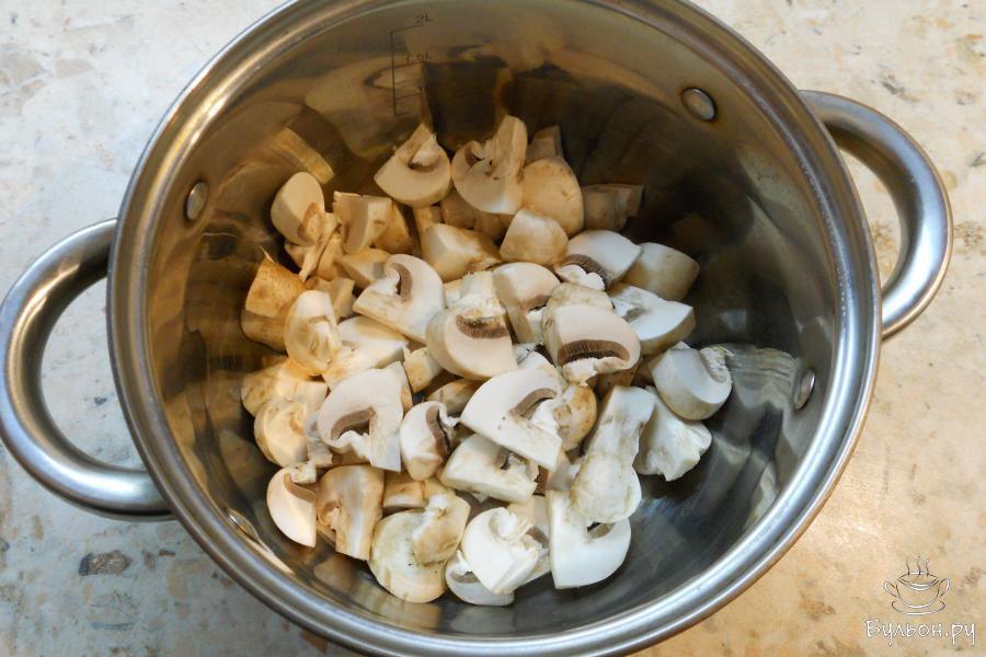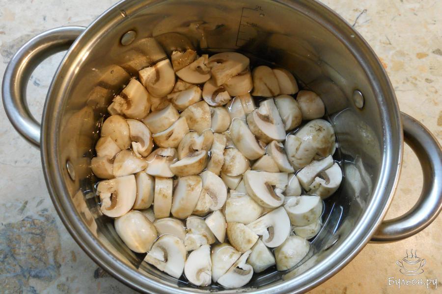 2. Залить грибы водой, чтобы она их покрывала. Поставить кастрюлю на огонь, варить шампиньоны 7 минут с момента закипания воды.