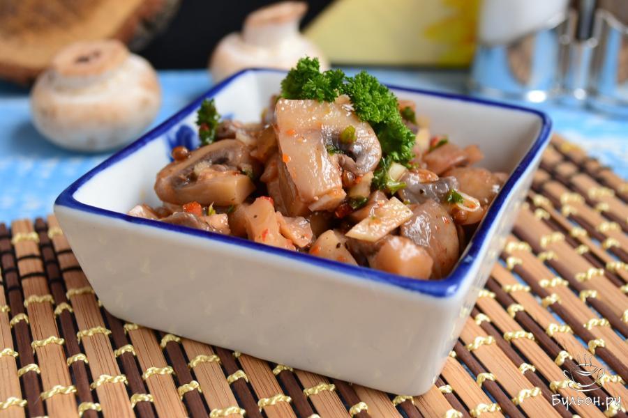 Предлагаю вам экспресс-рецепт шампиньонов, маринованных за десять минут. Такие грибочки отлично подойдут в качестве закуски для любого праздничного стола - остренькие, ароматные и очень вкусные. Эти шампиньоны можно использовать и для некоторых салатов. Хранить грибы нужно в стеклянной, закрытой таре в холодильнике до 4 дней. Чем больше грибы маринуются, тем насыщеннее становится их вкус.