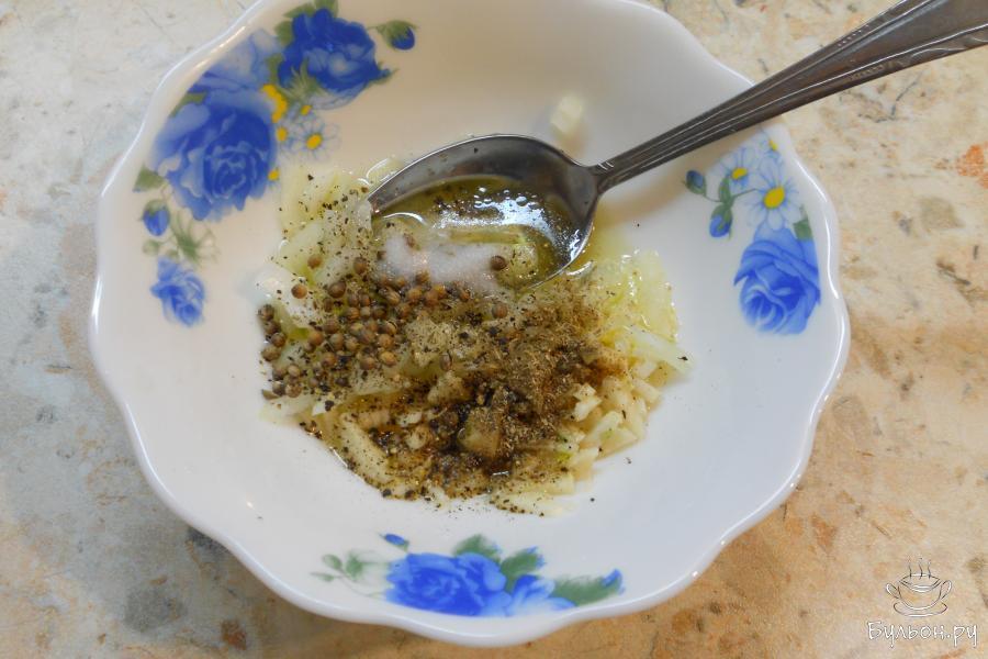 4. Добавить соль, сахар, растительное масло, кориандр молотый и кориандр в зернах, перец черный молотый.
