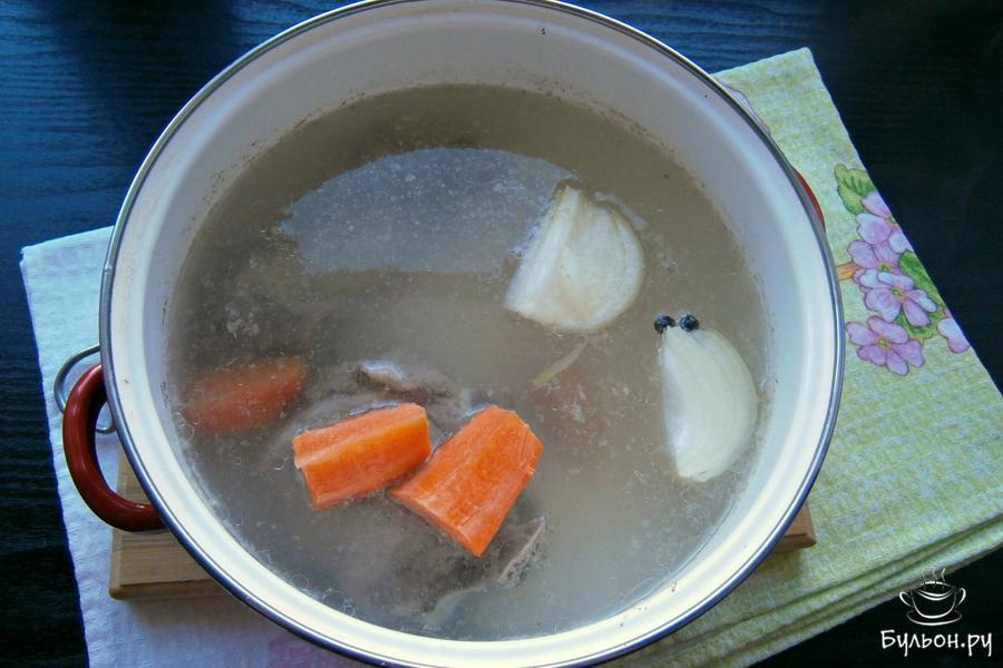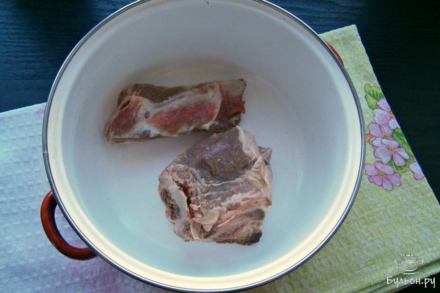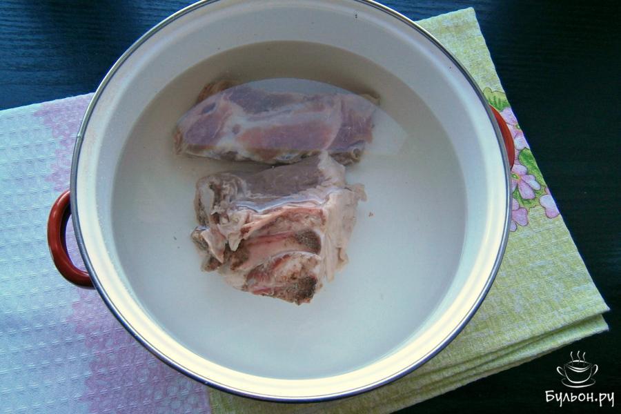 1. Для приготовления хорошего насыщенного и очень вкусного бульона, нужно выбирать молодую говядину на кости. Поместить мясо с костьми в кастрюлю.