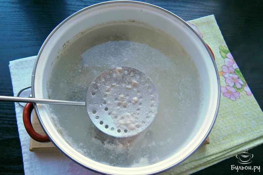 2. Залить проточной водой и поместить кастрюлю на довольно сильный огонь. Дать воде закипеть, огонь сразу уменьшить.