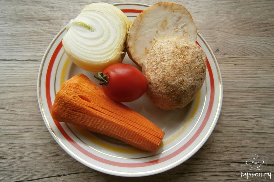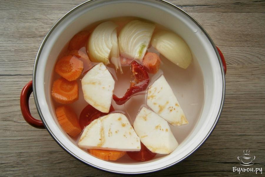 2. В кастрюлю порезать очищенный и разрезанный на части сельдерей, порезанные крупно: морковь, лук, на 2 части помидор. Добавить кусочек болгарского перца.