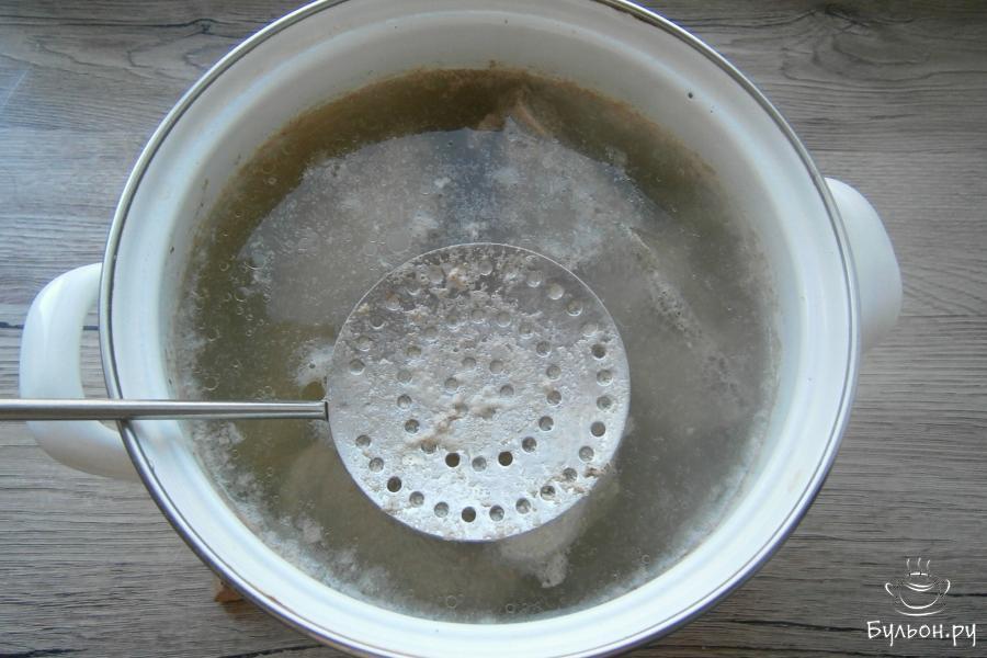 2. Залить мясо обычной холодной водой, поставить кастрюлю на огонь. Довести все до кипения, аккуратненько убрать пену, дать бульону покипеть на небольшом огне мин. 15.