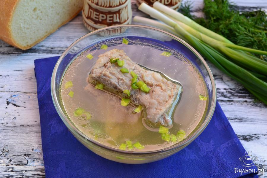 6. Также, из него можно приготовить заливное, добавив в горячий бульон желатин. Мясо следует отделить от костей, разложить в емкости и залить чуть остывшим бульоном. Затем, все остудить до комнатной температуры и поместить в холодильник до полного застывания. Приятного аппетита.