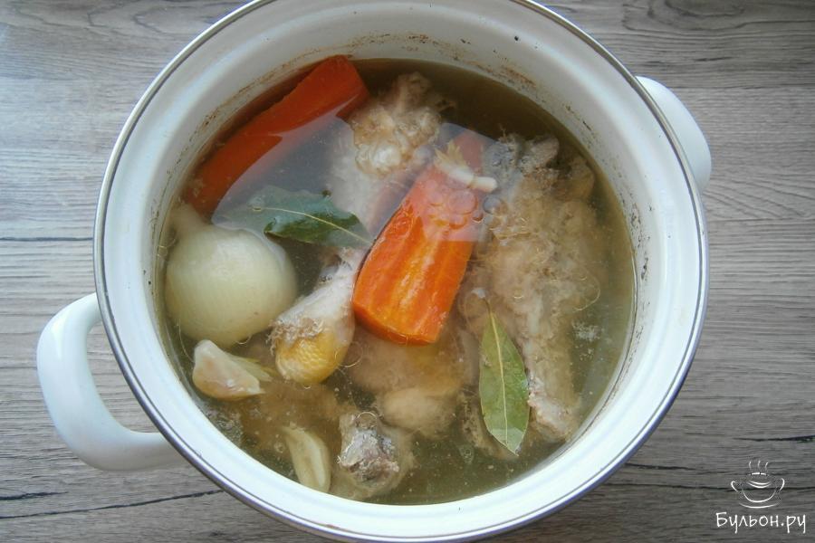 3. Добавить в кастрюлю целую очищенную от шелухи луковицу, разрезанную на 2 части морковку, зубчик чеснока, горошины душистого и черного перцев. Далее, варить бульон с мясом на самом маленьком огне, не давая сильно кипеть, около полутора часов.