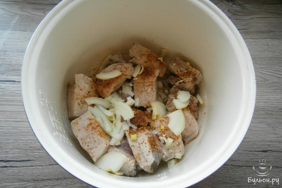 2. В чашу влить любое масло растительное, выставить программу "выпечка" на 20 мин. Через 5 мин. добавить в чашу ребра, посолить их, посыпать мясной приправой, перемешать. Еще через 5 минут добавить порезанный средними кусочками репчатый лук. Готовить ребра далее оставшееся время.