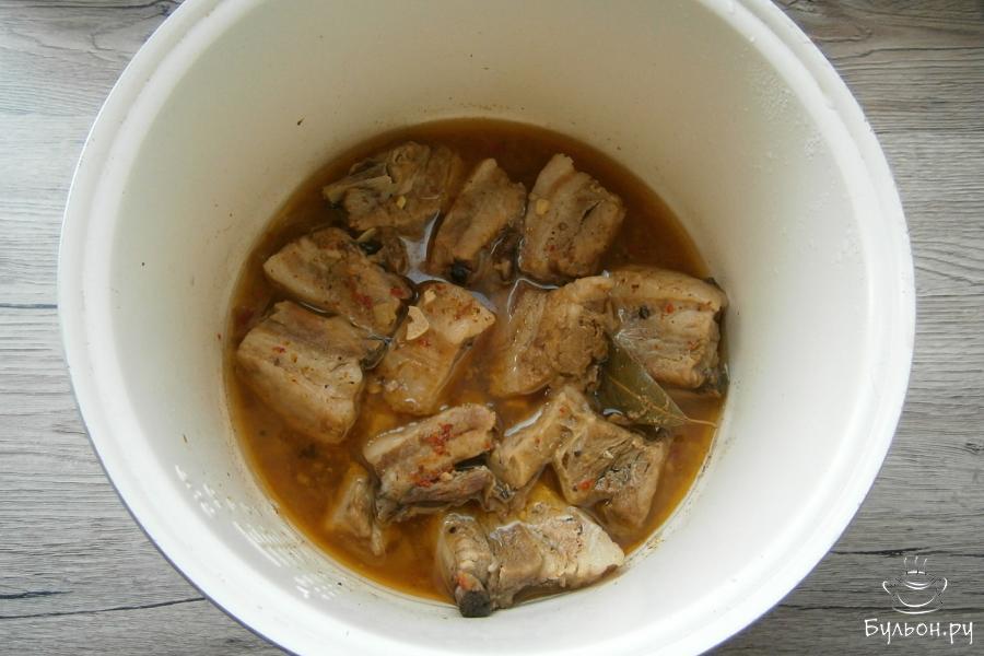 5. Закрыть крышку и выставить программу "тушение" на 1 ч. 10 мин. После звукового сигнала тушеные ребра можно подавать с гарниром к столу.