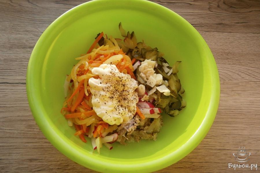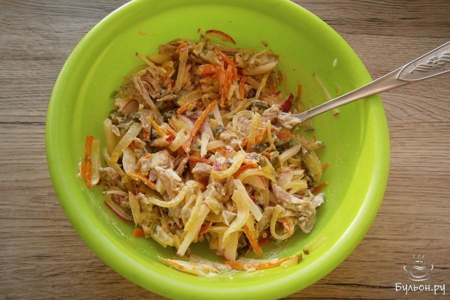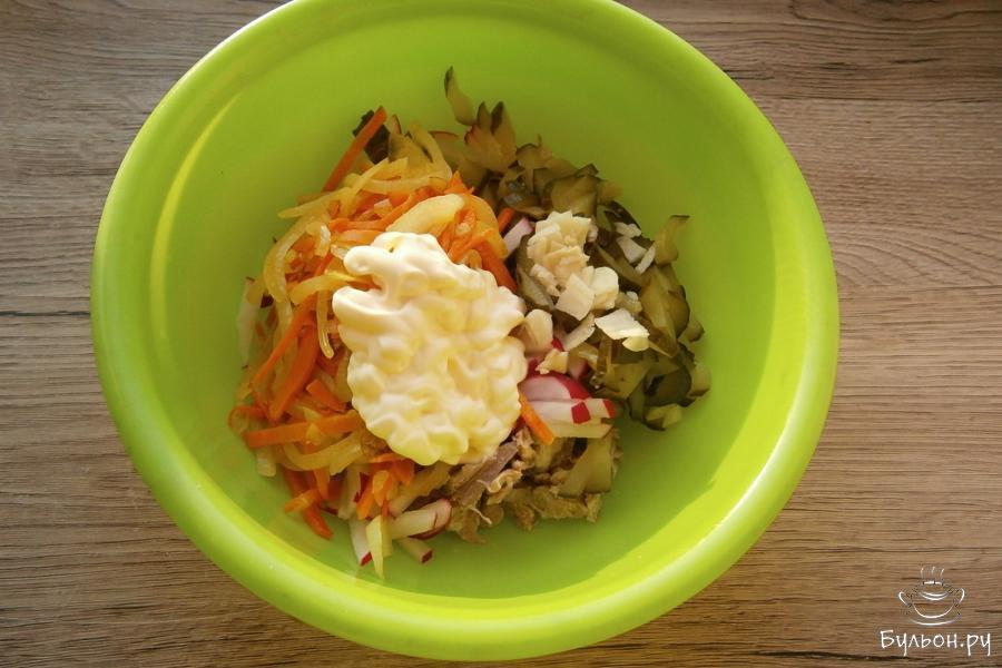 3. Говядину, предварительно отваренную и охлажденную, порезать кусочками, добавить порезанный брусочками редис.