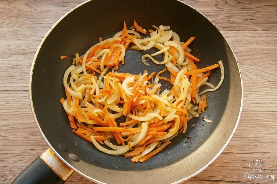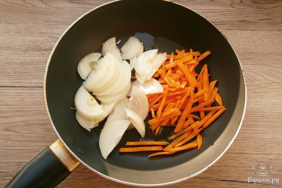 1. Порезать луковицу тонкими полукружками, морковь натереть или на корейской терке, или на обычной. Поместить овощи в разогретую сковороду с маслом растительным.