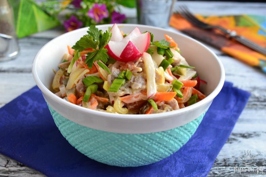 Салаты - неотъемлемая часть любого повседневного или праздничного стола. Предлагаю вам вариант мясного салата, который можно приготовить на обед или ужин, его, вполне, можно предложить и гостям. Салатик необычайно вкусный и довольно сытный. Я, для салата, использовала предварительно отваренную говядину, можно заменить свининой или курицей. Если вы не хотите заправлять салат майонезом, воспользуйтесь сметаной, добавив к ней немного готовой горчицы. Попробуйте этот салат, он обязательно понравится вашим близким и гостям.