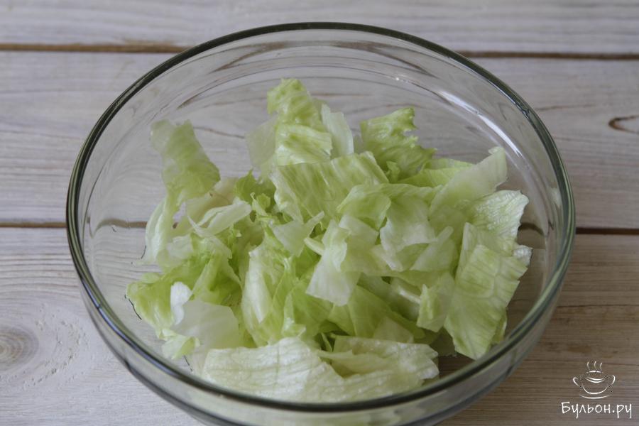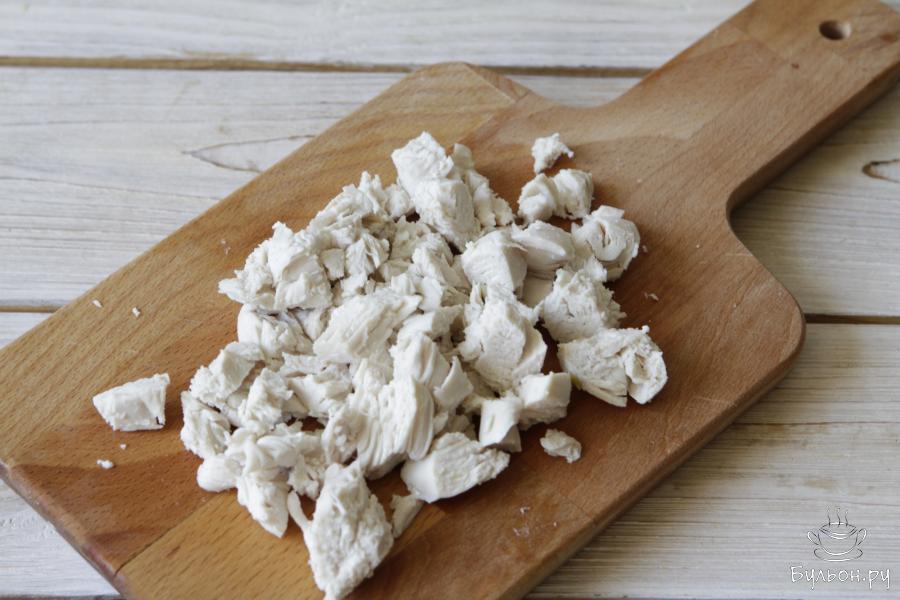 1. Куриную грудку можно отварить заранее. Ее остудить и нарезать на небольшие квадратики. Бульон можно использовать по своему назначению.