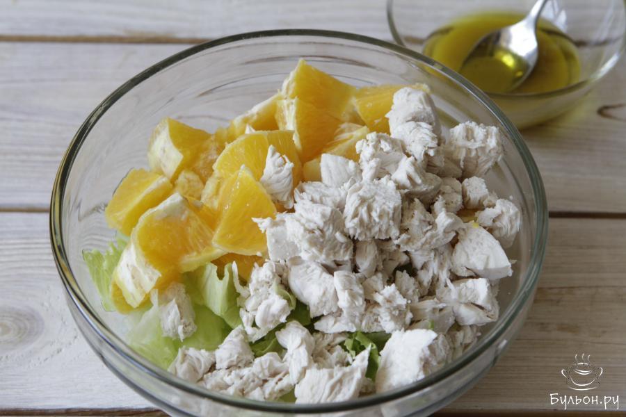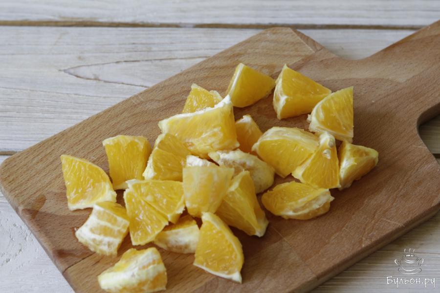 3. Один крупный или два небольших апельсина почистить, разделить на дольки и нарезать на квадраты. Сильно не мельчить.