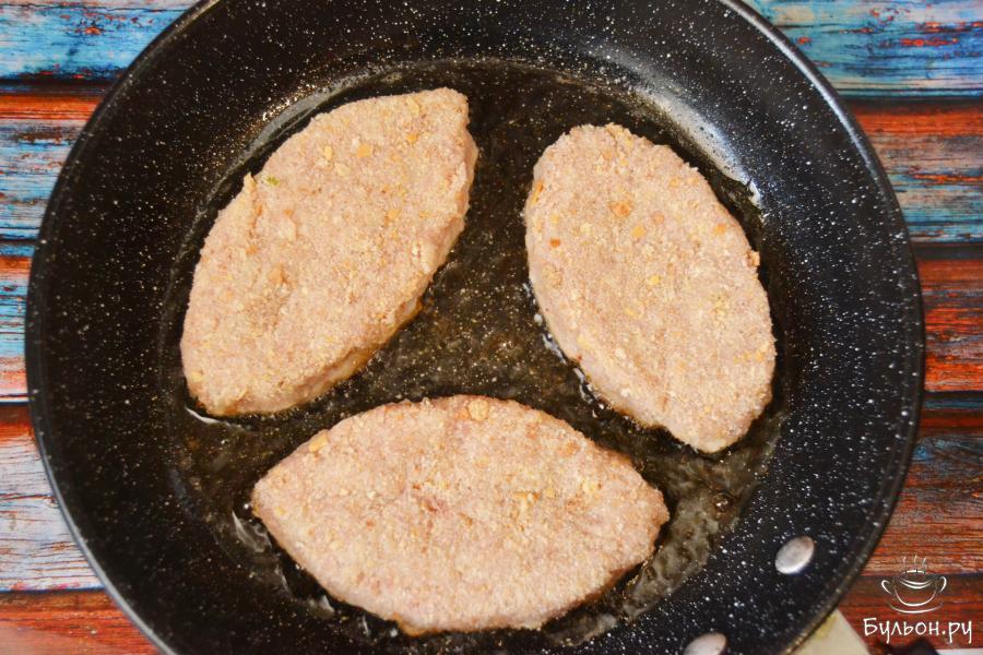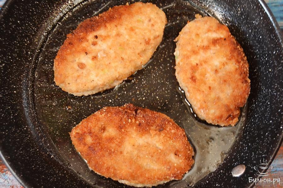 11. Обжариваем котлетки на среднем огне, затем огонь уменьшаем. Переворачиваем котлетки и жарим до готовности. Следим, чтобы не получилось так, что снаружи котлеты будут поджаренными, а внутри останутся сырыми. Чтобы так не вышло, можно накрыть котлеты крышкой.