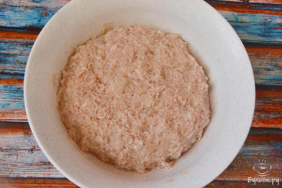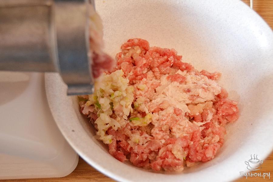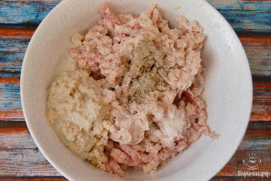 1. Для пикантности в свиной фарш добавим лук и чеснок. Количество этих ингредиентов можно откорректировать на свой вкус.