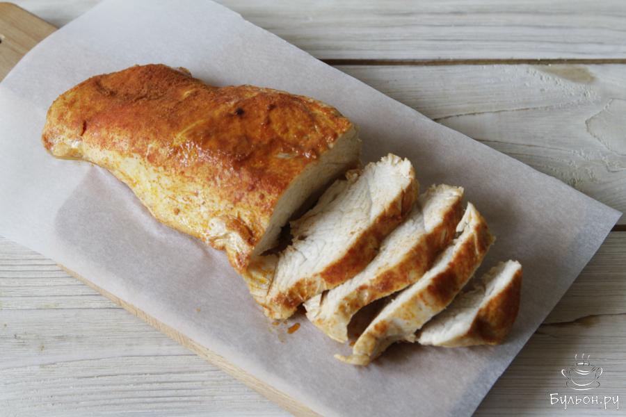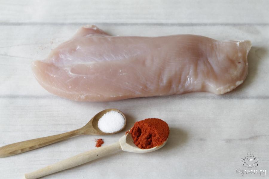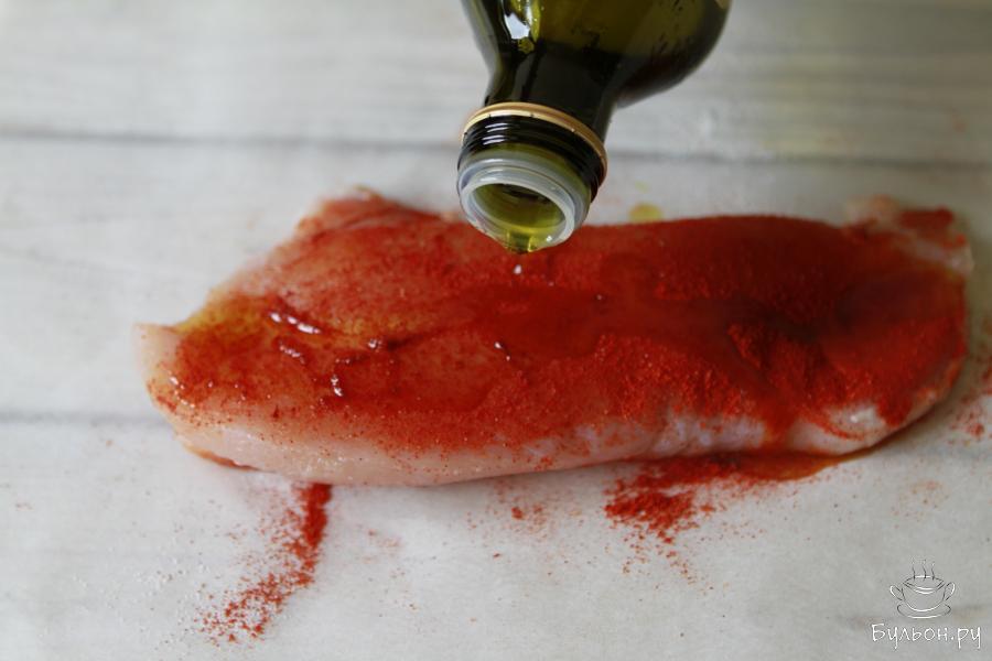 2. Филе индейки посолить и приправить сладкой паприкой. Специи хорошо растереть по всей поверхности.