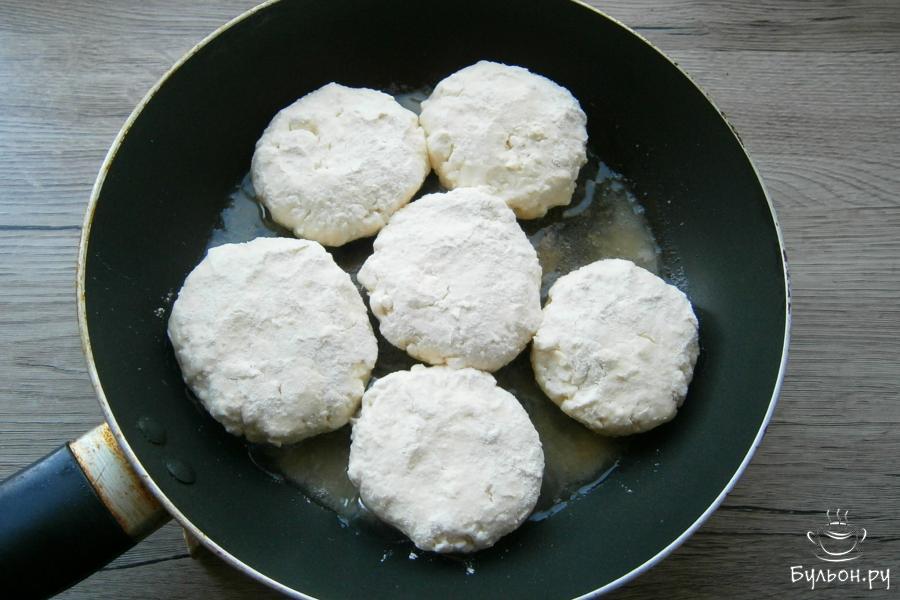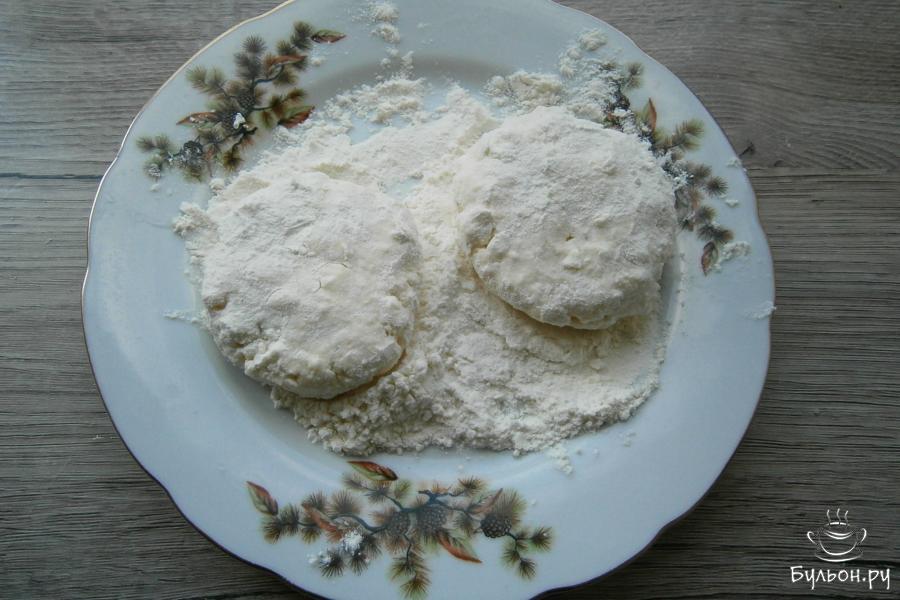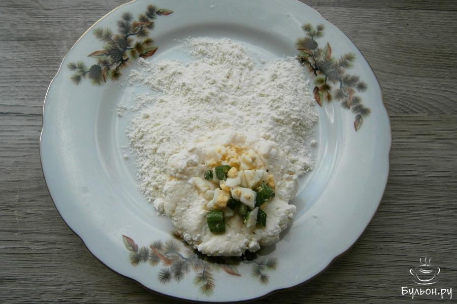 5. Оставшуюся муку насыпать на плоскую тарелку. Влажными руками слепить из творожного теста лепешку, в середину которой поместить ложку яично-луковой смеси.