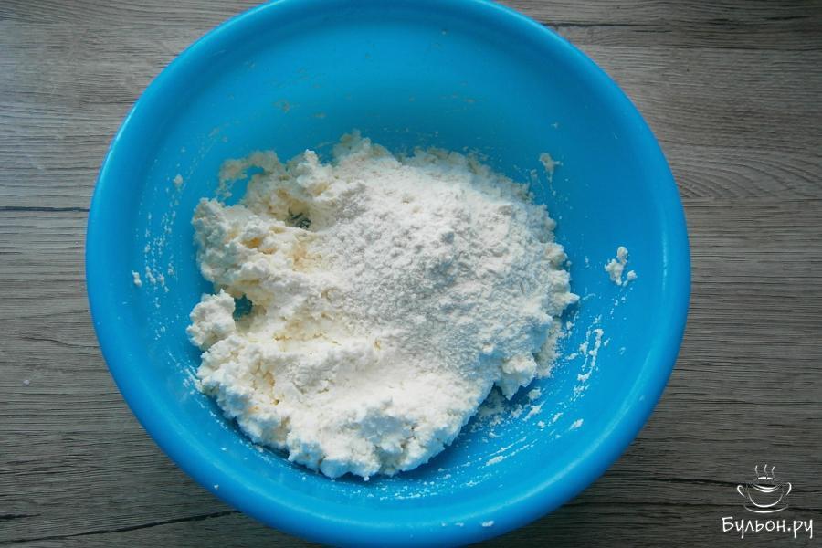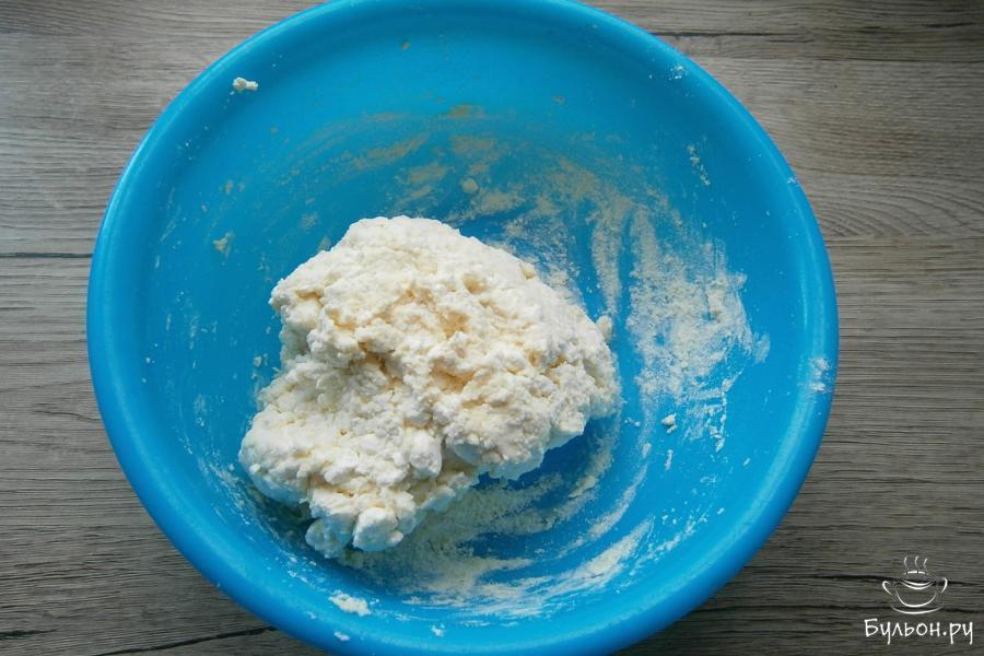 3. Хорошенько перемешать творог с яйцом до почти однородного состояния, всыпать 2/3 стак. пшеничной муки.