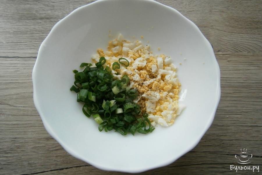 1. Одно яйцо нужно отварить и очистить. Далее, порубить ножом, добавить мелко порезанный зеленый лук, все немного посолить и добавить чуточку черного перца, все перемешать.
