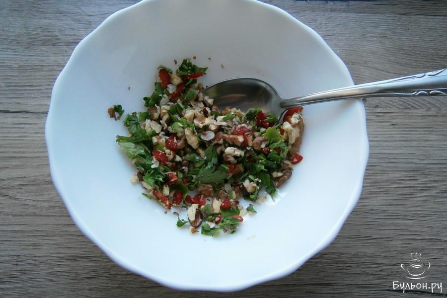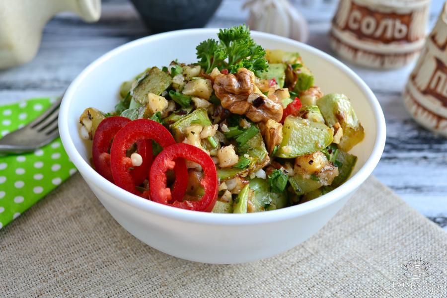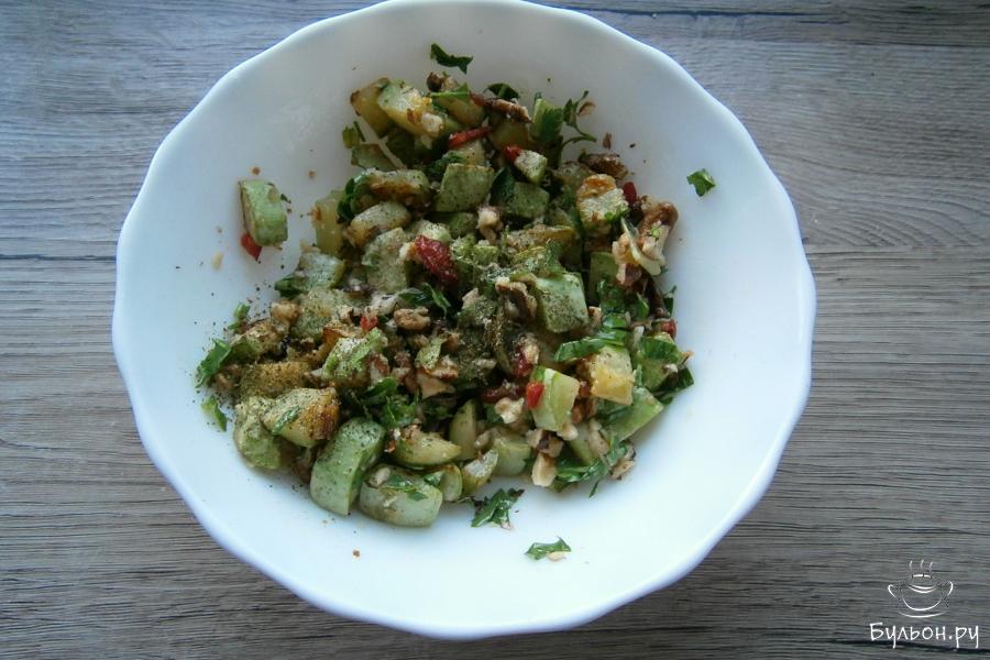 5. Горячие кабачки смешать со смесью орехов, чеснока, чили и зелени. Посолить все по вкусу, посыпать хмели-сунели и перцем свежемолотым черным. Все еще раз перемешать и дать закуске остыть.