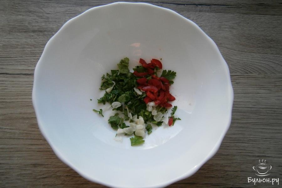 2. Зелень петрушки измельчить, добавить порезанный мелко перец чили и порезанный тонкими кусочками или кружочками чеснок.