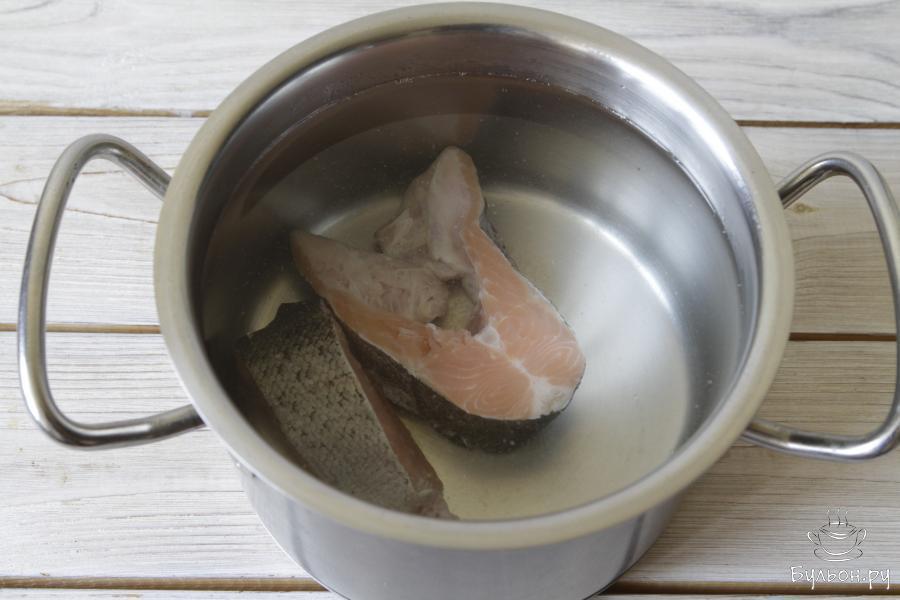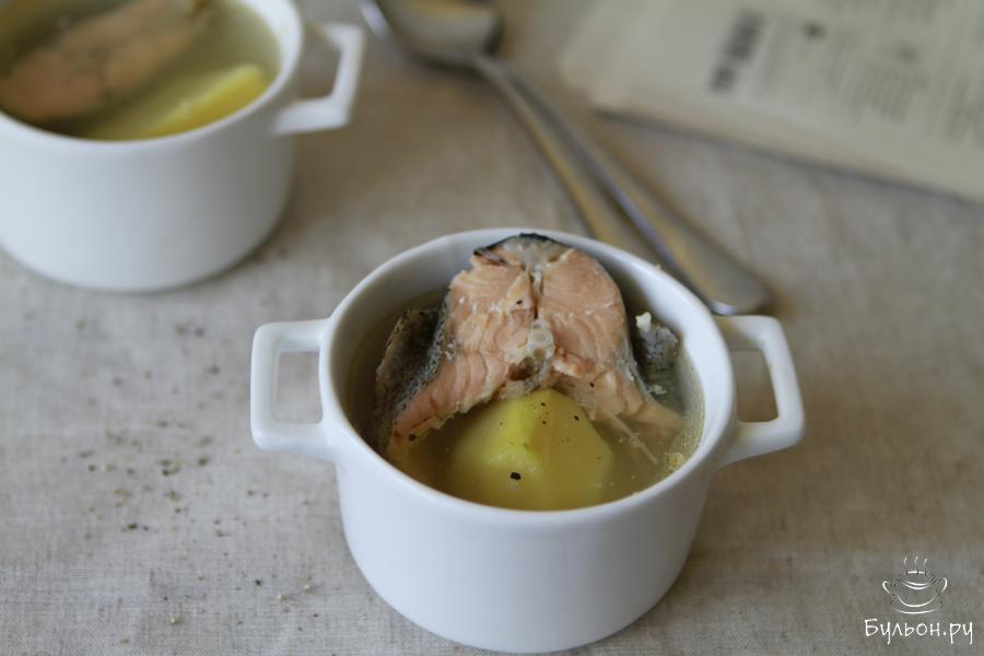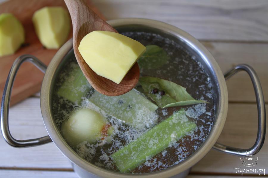 5. Картофель добавляем по желанию. На две порции вполне достаточно одной крупной картофелины. Для аромата рыбного бульона не забудьте положить лавровый лист и черный перец. А вот посолить суп нужно будет в самом конце.