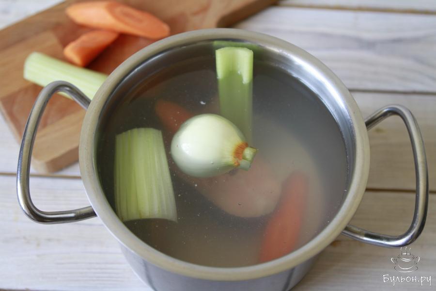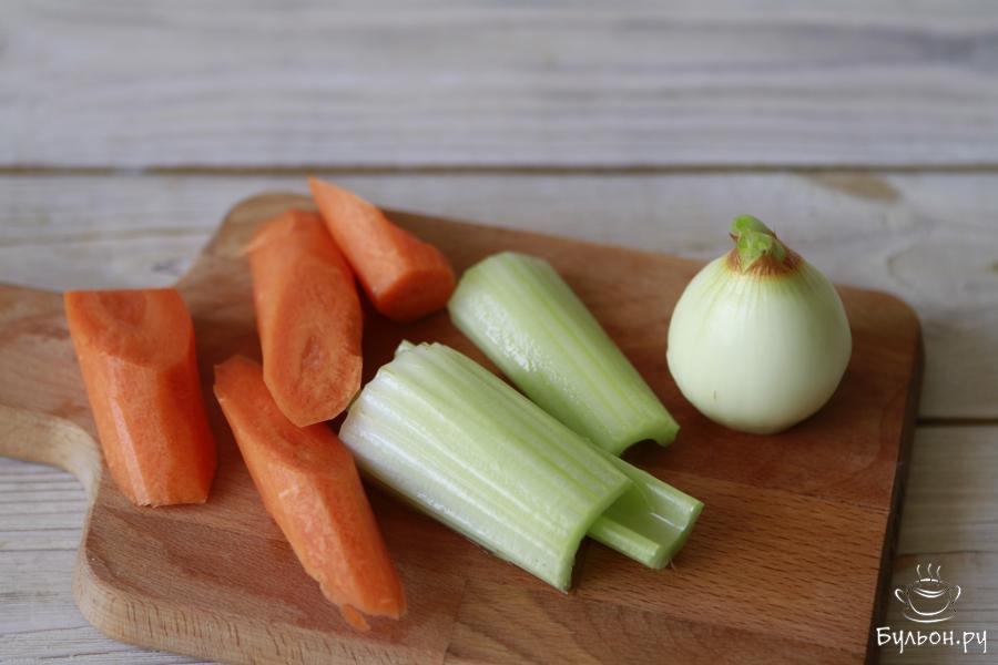 2. Из овощей приготовить: одну небольшую головку репчатого лука, небольшую морковь и пару стеблей сельдерея. Овощи почистить и порезать на свое усмотрение.