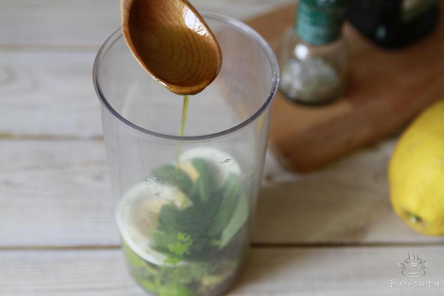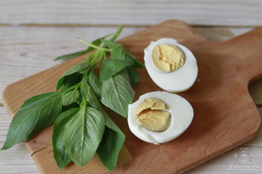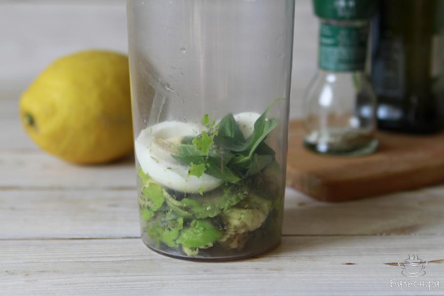 4. Все ингредиенты переложить в чашу блендера: мякоть авокадо, яйцо, листья базилика и прованские травы.