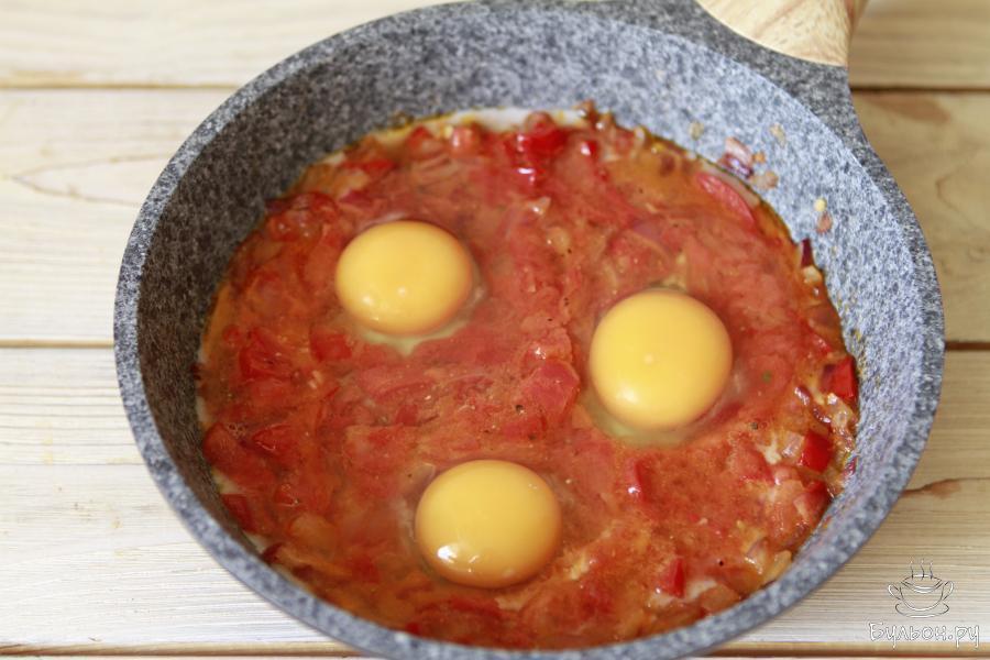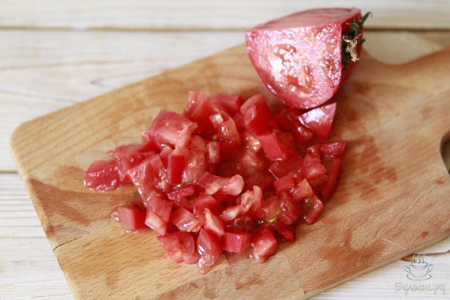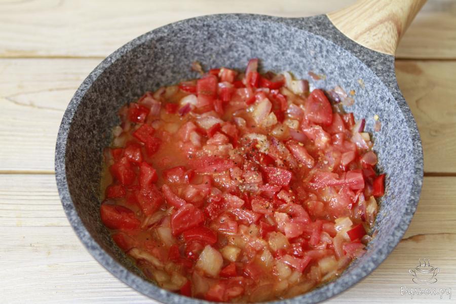 4. На растительном масле слегка обжарить лук с болгарским перцем (буквально пару минут). Затем добавить подготовленные томаты. Потушить овощи пару минут. Посолить поперчить и добавить молотый перец чили.