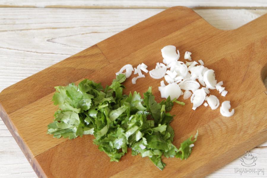 3. Кинзу нашинковать, а чеснок порубить или пропустить через пресс ( в нашем случае был использован свежий чеснок).