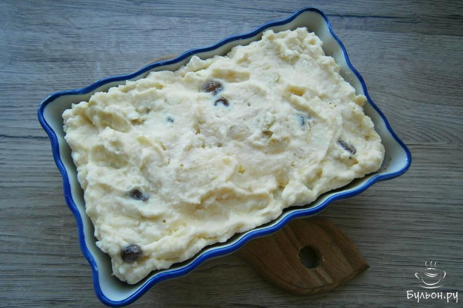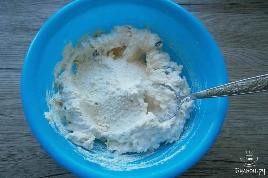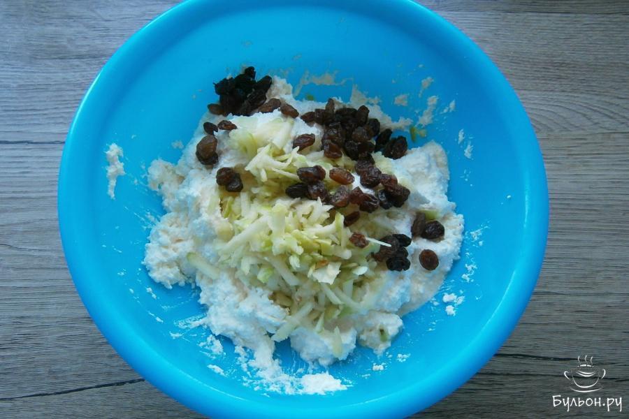 3. Добавить в массу из творога очищенное и натертое яблоко среднего размера. Сюда же, добавить изюм без косточек.